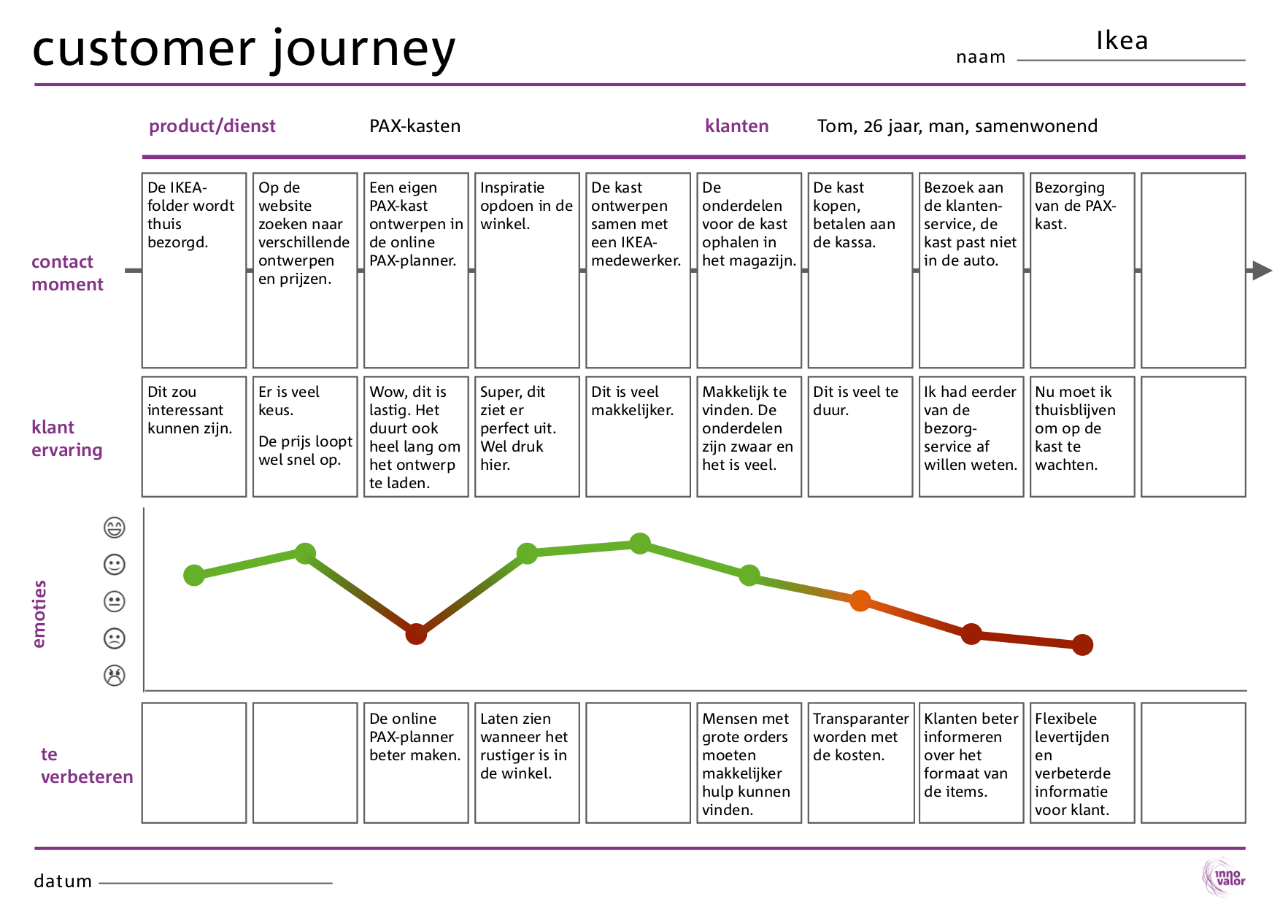 Print de template van de Customer Journey groot uit om te gebruiken in een brainstorm. Gebruik Post-its om iets in de Customer Journey te zetten. Zo kun je er gemakkelijk iets bij zetten of iets verplaatsen indien nodig. Voor inspiratie en een voorbeeld van een praktische toepassing van de Customer Journey kun je naar het voorbeeld voor IKEA kijken.