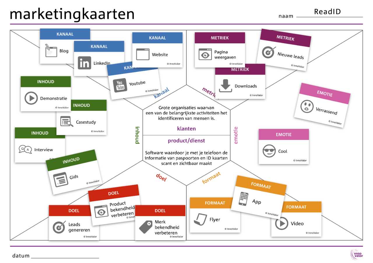 Print de template en de Marketing kaarten uit om te gebruiken in een brainstorm. Als je denkt aan een format, kanaal of een ander element dat niet op een kaart staat, schrijf deze dan zelf op in je canvas. Laat je inspireren door het voorbeeld van ReadID en leer van de praktische toepassing van de Marketing Kaarten.