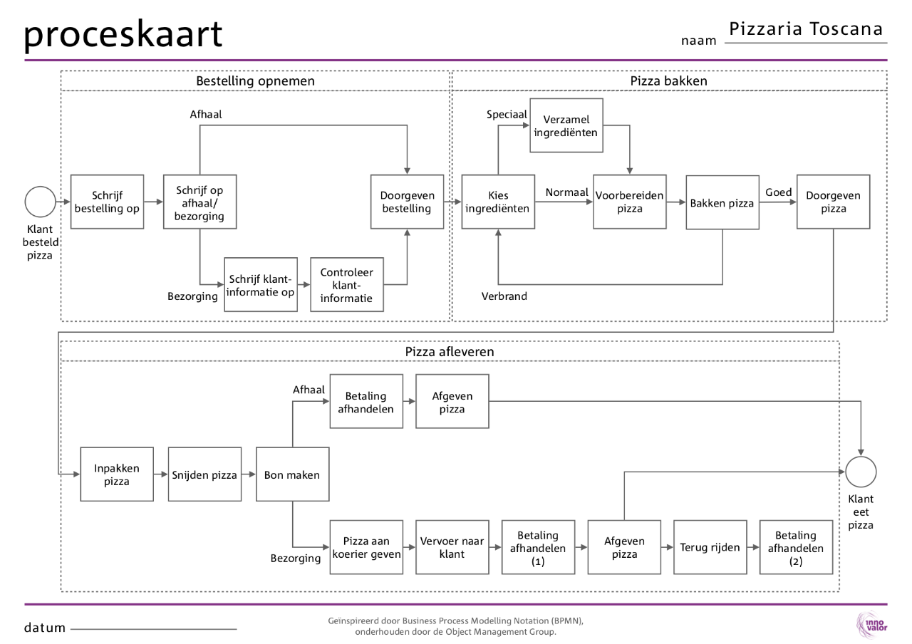 Kijk voor inspiratie naar de Proceskaart van Pizzeria Toscana om te zien hoe een proces wordt weergegeven met de Proceskaart.