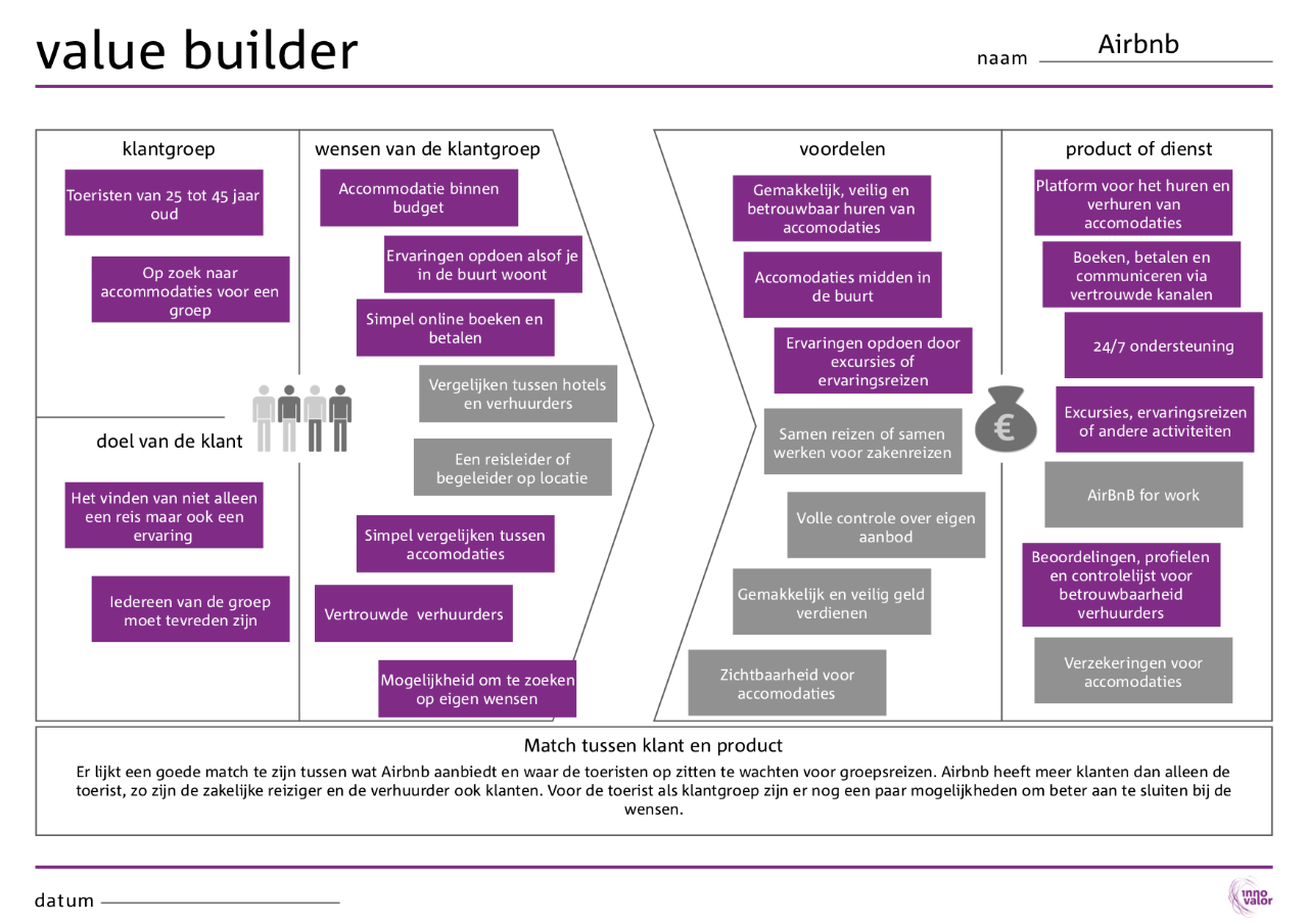 Download het Value Builder canvas en print deze op een groot stuk papier om te gebruiken tijdens een brainstormsessie. Om te zien hoe je de Value Builder in de praktijk kan gebruiken kun je het voorbeeld van Airbnb downloaden.