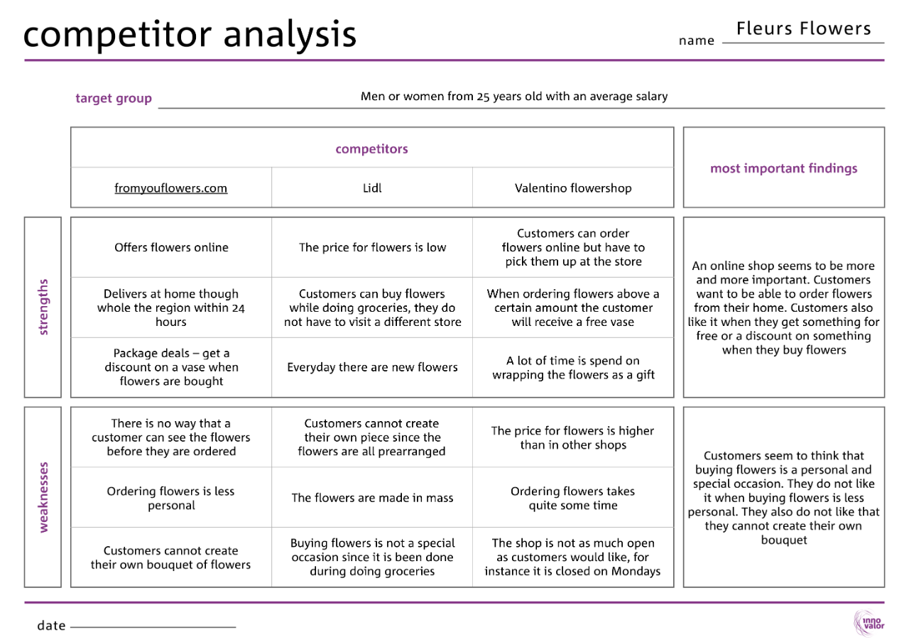 Have a look at the example of Fleur Flowers to get an understanding of a Competitor Analysis.