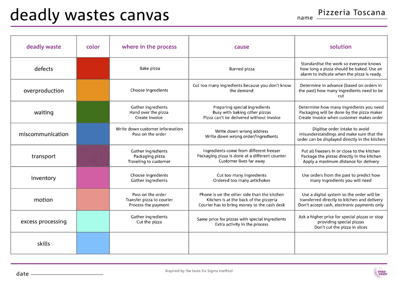 Use the Deadly Wastes Canvas to brainstorm how to improve the efficiency of your process. Have a look at the example of Pizzeria Toscana to get inspired and learn from the practical application of this tool.