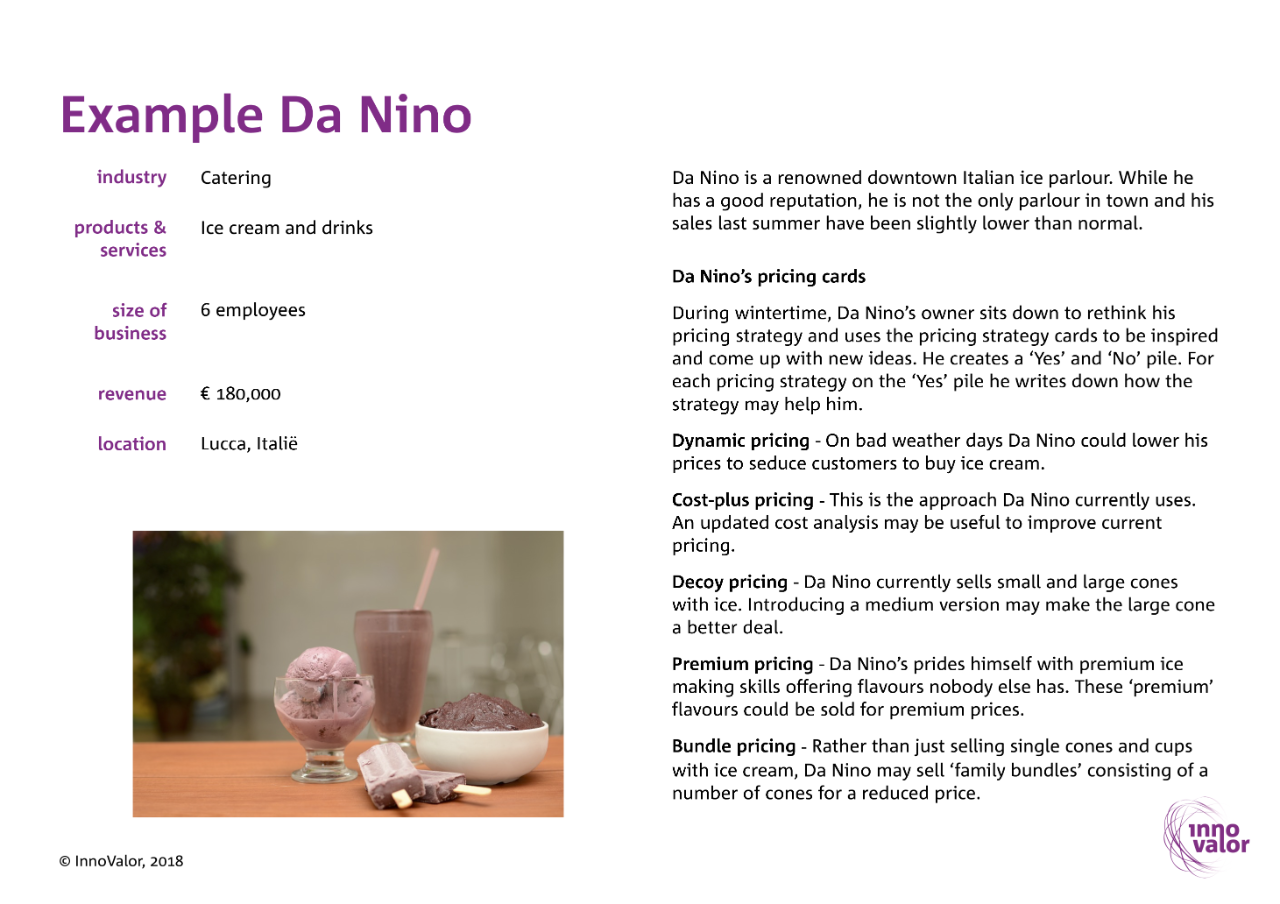Use the Pricing Cards to brainstorm about your pricing options. Have a look at the example for ice cream parlour Da Nino, to get inspired and learn about the practical application of the cards.