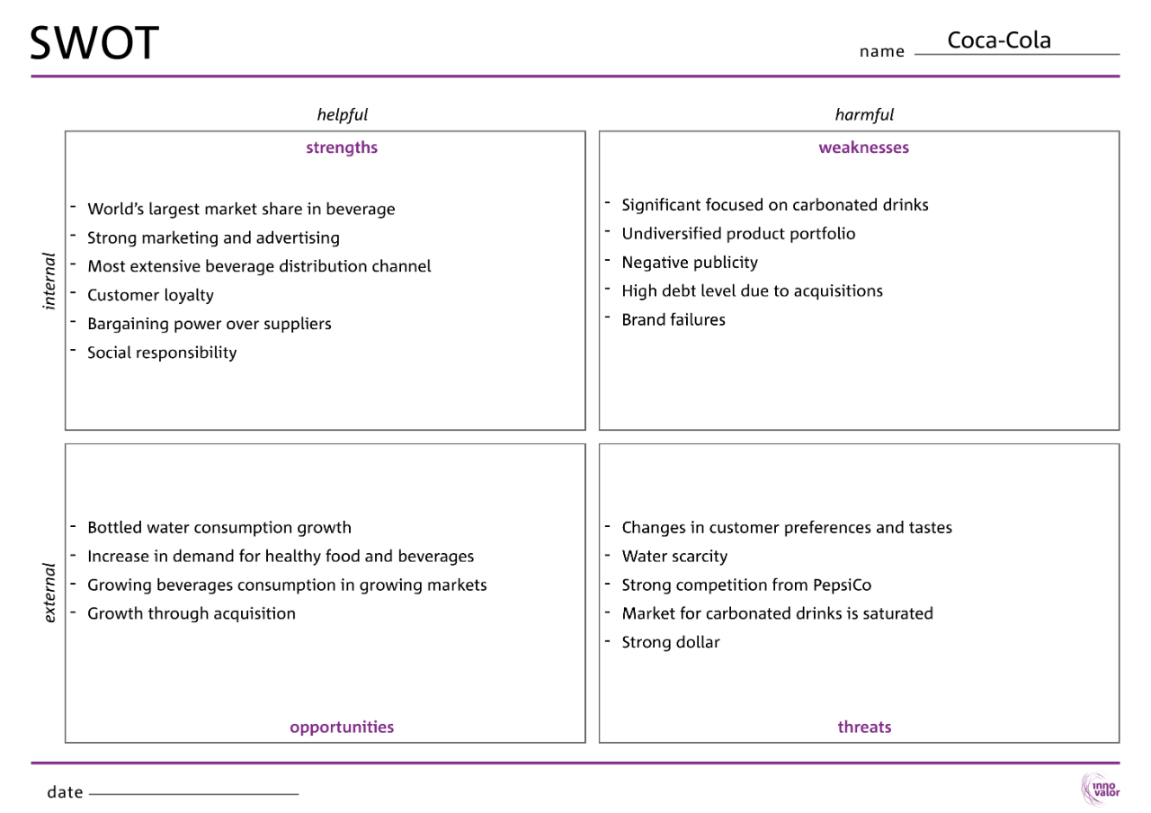 Use the SWOT template to make a large printout and use this to do a SWOT, for example in a brainstorm. Download the example for Coca Cola to learn about the practical application of the SWOT.